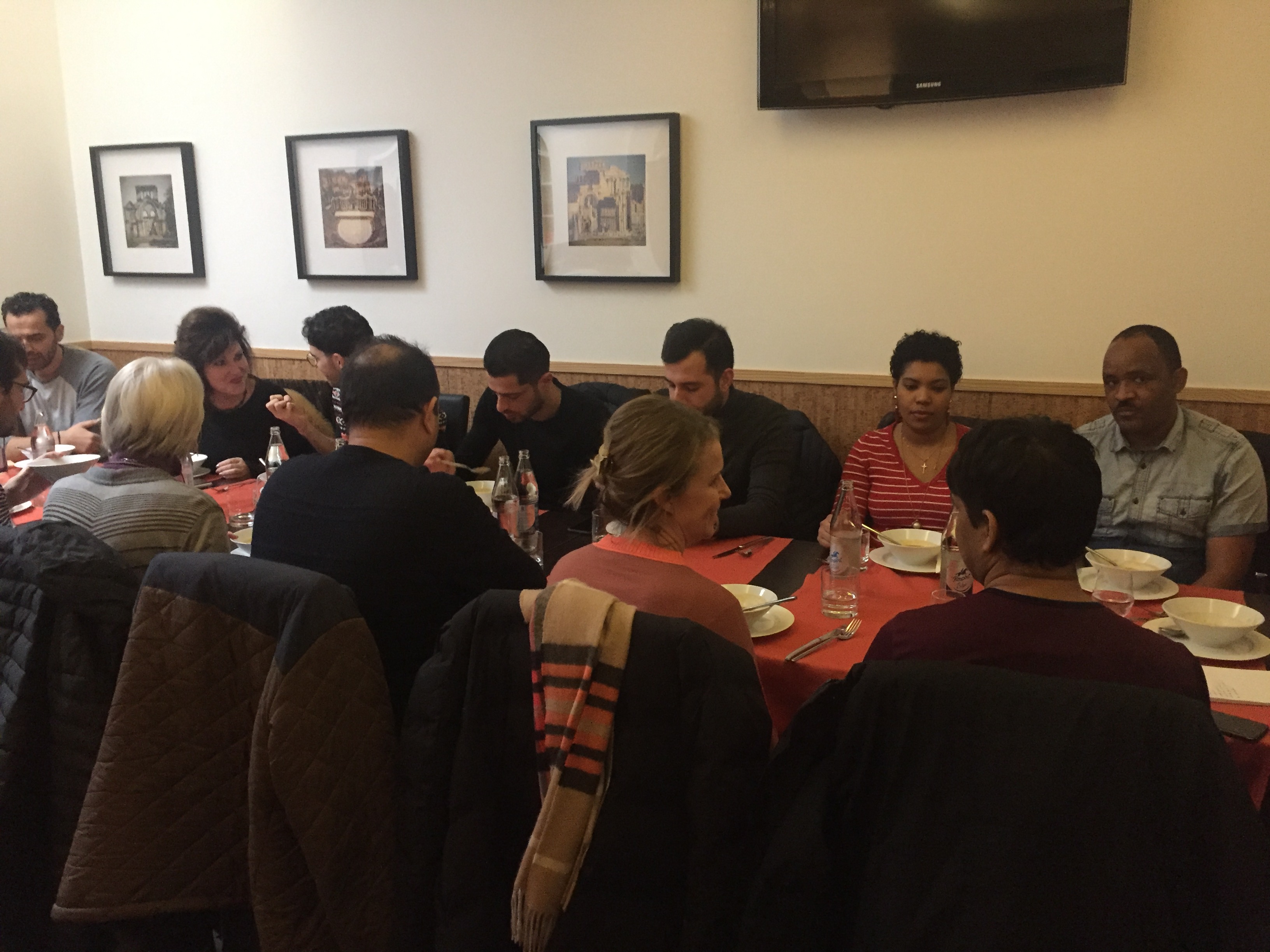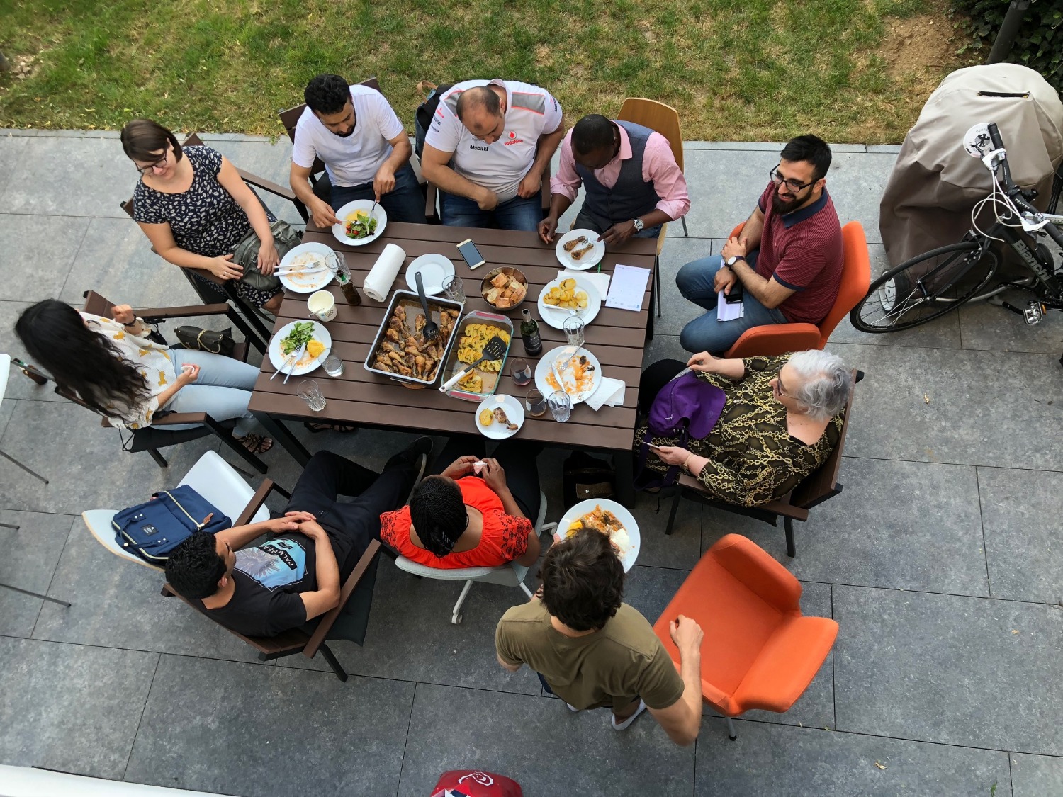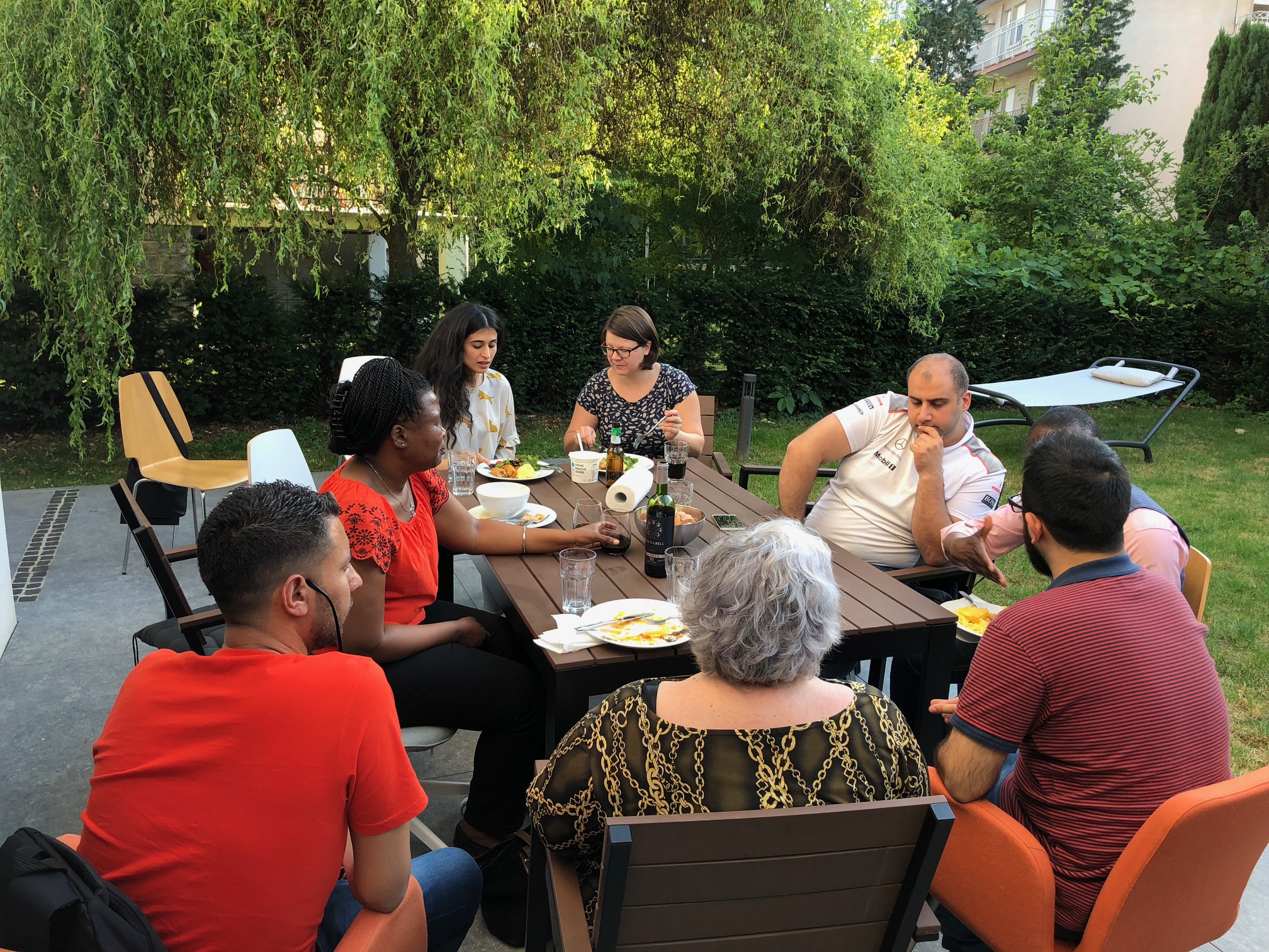 On July 2nd, a dinner event was held in order to introduce ten Sleeves Up participants to four volunteer teachers and plan future conversation practice. Eight volunteer instructors (3 for English, 4 for French, and 1 for Luxembourgish) and 14 students are now involved in the program. This generous support from volunteers has allowed us to set up individual as well as group conversation practice for Sleeves Up participants, depending on need.